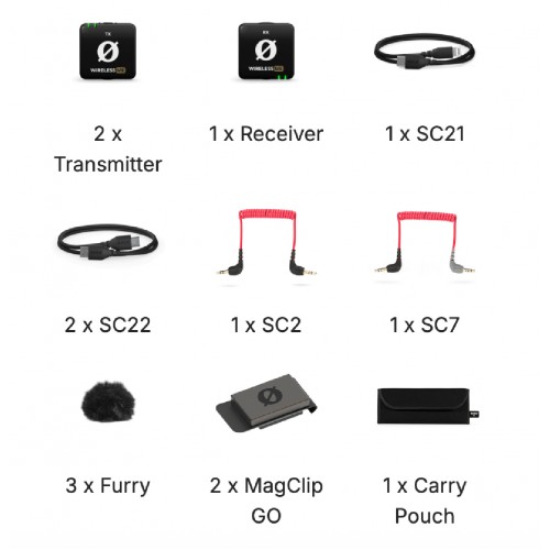 المحتويات | Transmitter*2 | Receiver*1 | SC7*1 | SC2*1 | SC21*1 | SC22*2 | Furry*3 | MagClip GO*2 | Carry Pouch*1 |